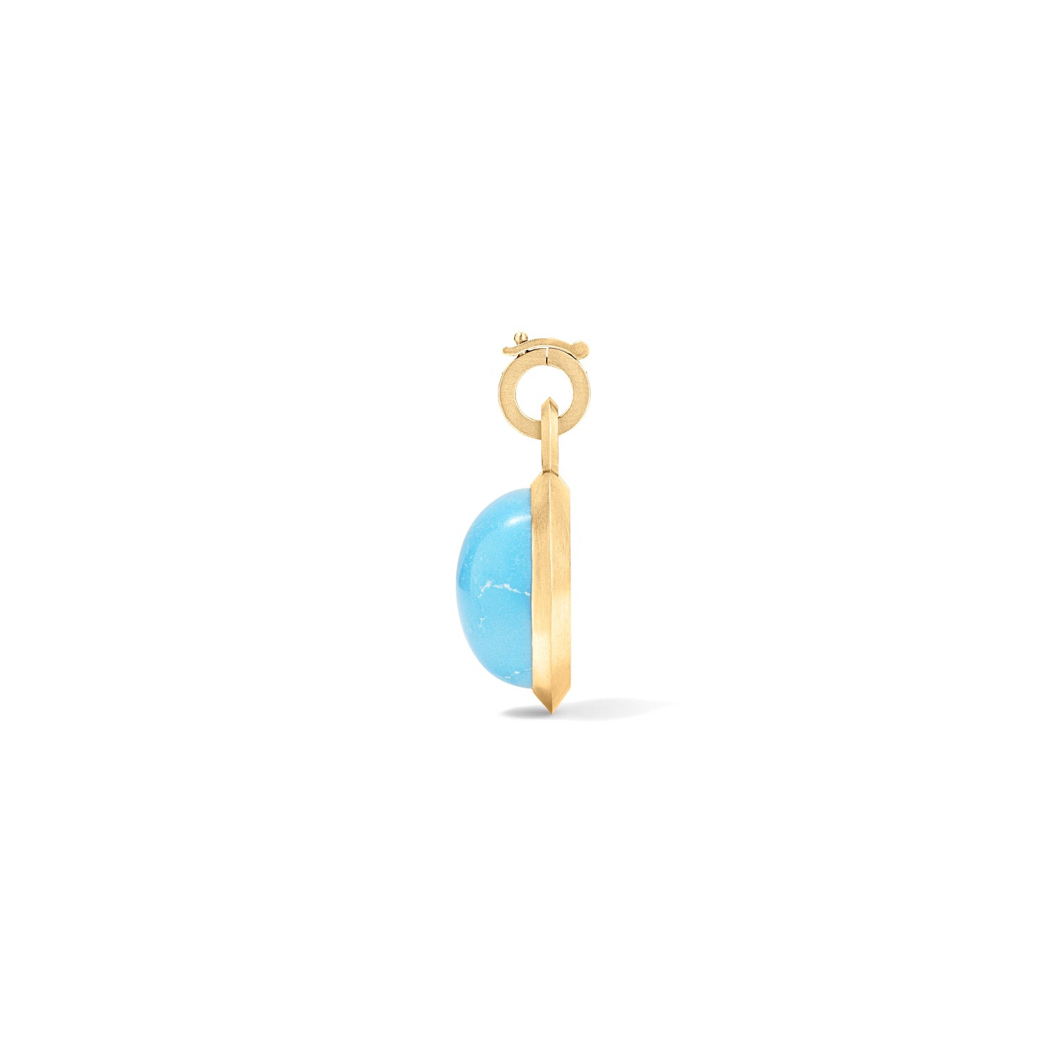 A modern talisman in 18k brushed gold, anchored by a vivid 13.60 carat Persian Turquoise Oval Cabochon. The detachable bail set with .08 carats of VVS Diamonds. Designed as a singular creation, this pendant’s balance of geometry and gem intensity makes it a striking statement, and grants access to Etiq Club.