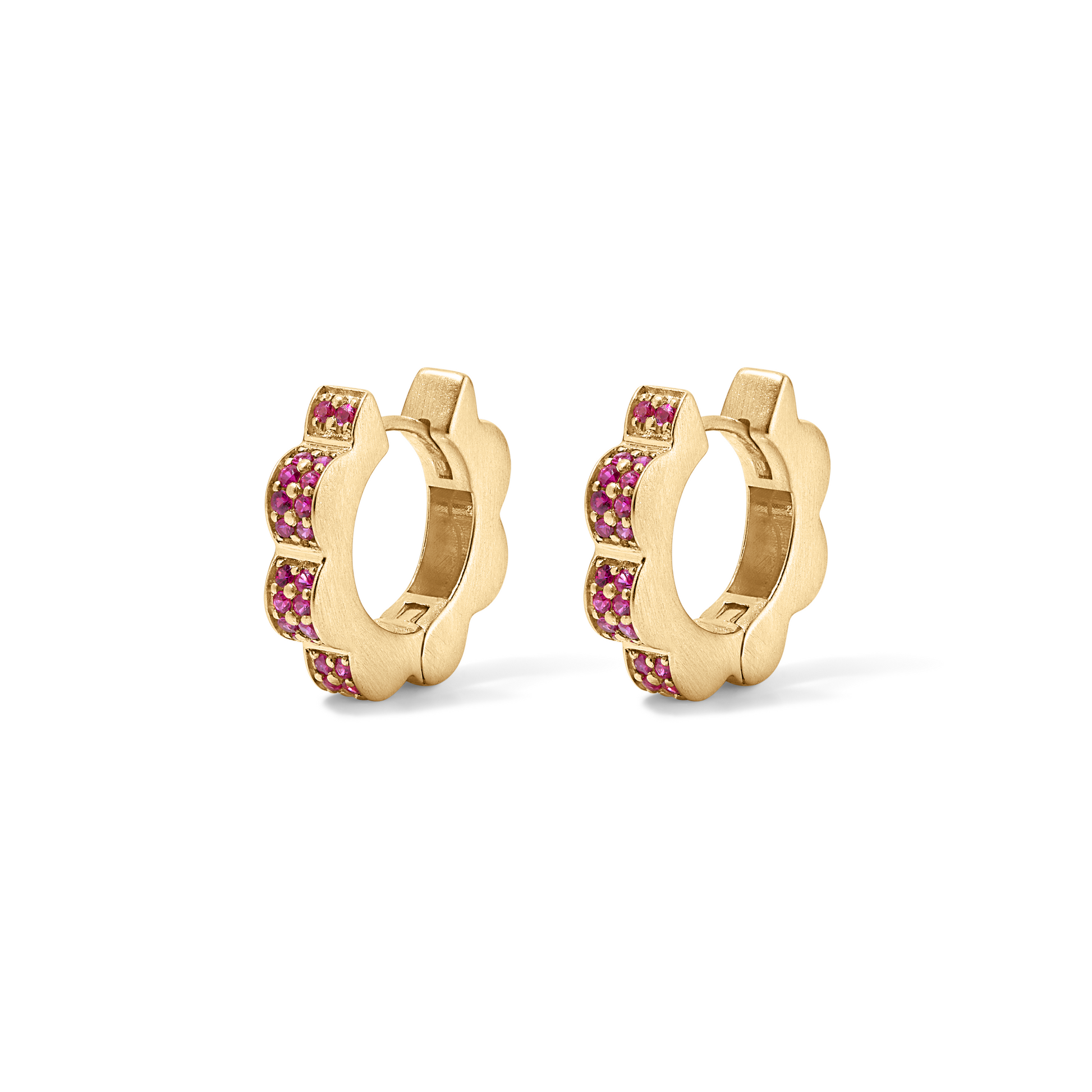 Inspired by jharokha architecture, discover our Garden Hoops, featuring 0.52cts of rubies set in 18k yellow gold. Their elegant design brings a refined sparkle to any outfit, making them perfect for both everyday wear and special occasions.
